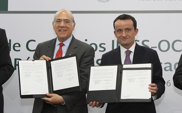 El Director General del Seguro Social, Mikel Arriola, y el Secretario General de la Organización para la Cooperación y el Desarrollo Económico, José Ángel Gurría Treviño, signaron convenios para dar seguimiento a la implementación de recomendaciones de la OCDE; analizar y evaluar las políticas de compras públicas en el IMSS y medir el impacto de las acciones de digitalización y simplificación de trámites.