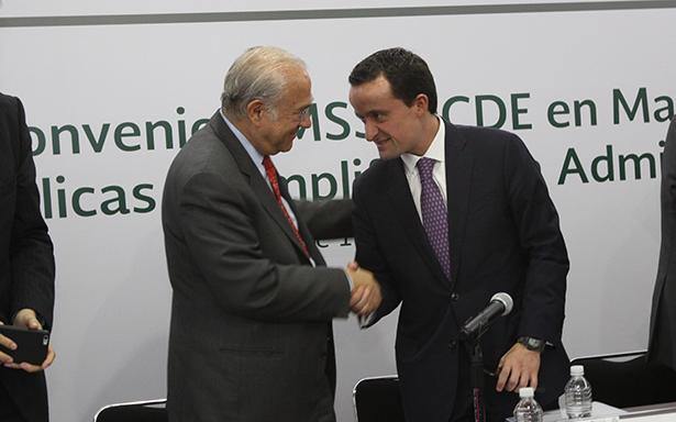 El Director General del Seguro Social, Mikel Arriola y el Secretario General de la OCDE, José Ángel Gurría Treviño, signaron los convenios para incrementar eficiencias en el manejo del gasto, con acciones de fortalecimiento financiero y de simplificación de trámites en el IMSS, que se han impulsado en la actual administración con el Esquema de Compra Consolidada y la Estrategia IMSS Digital.