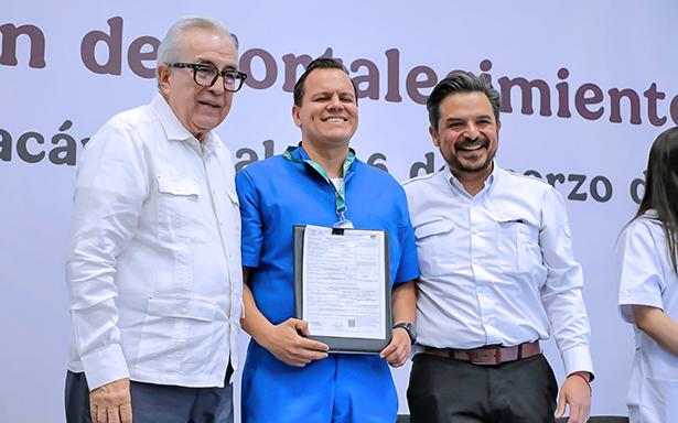 Durante la ceremonia se entregaron de manera simbólica 10 plazas al personal basificado. En representación de los beneficiados, la doctora Karla Margarita Cárdenas López, especialista en Pediatría, dijo que este logro dignifica y motiva al personal en su compromiso con la atención.