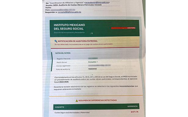 La Dirección de Incorporación y Recaudación (DIR) del Instituto Mexicano del Seguro Social (IMSS) alerta a patrones con personas trabajadoras afiliadas a la institución del envío de correos electrónicos falsos con supuestas notificaciones de inicio de auditorías, que incluso pueden ser enviados de correos electrónicos con el dominio @imss.gob.mx, a fin de evitar situaciones de riesgo al dar clic en algún enlace.