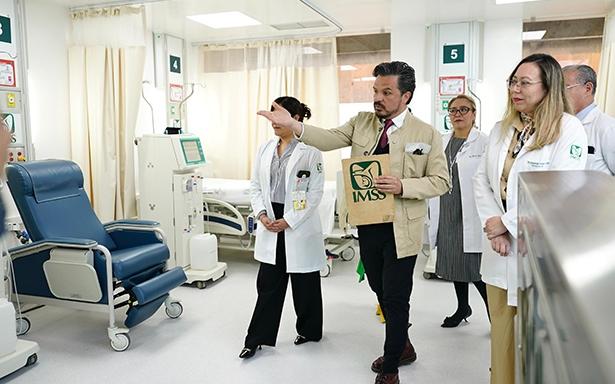 Acompañado de autoridades del Instituto en Nivel Central y de la Unidad Médica de Alta Especialidad (UMAE), el titular del Seguro Social recorrió el servicio de Hemodiálisis que permitirá la atención simultánea en diez módulos, con espacios aislados y áreas que antes no existían como residencia médica y consolas verticales en cada punto, a fin de garantizar la operación continua y eficiencia operativa.
